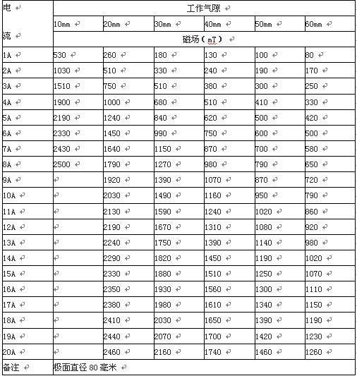 4.4 磁場(chǎng)強度:工作氣隙20mm時(shí),80mm極頭中心磁場(chǎng)最大H≥2.2T